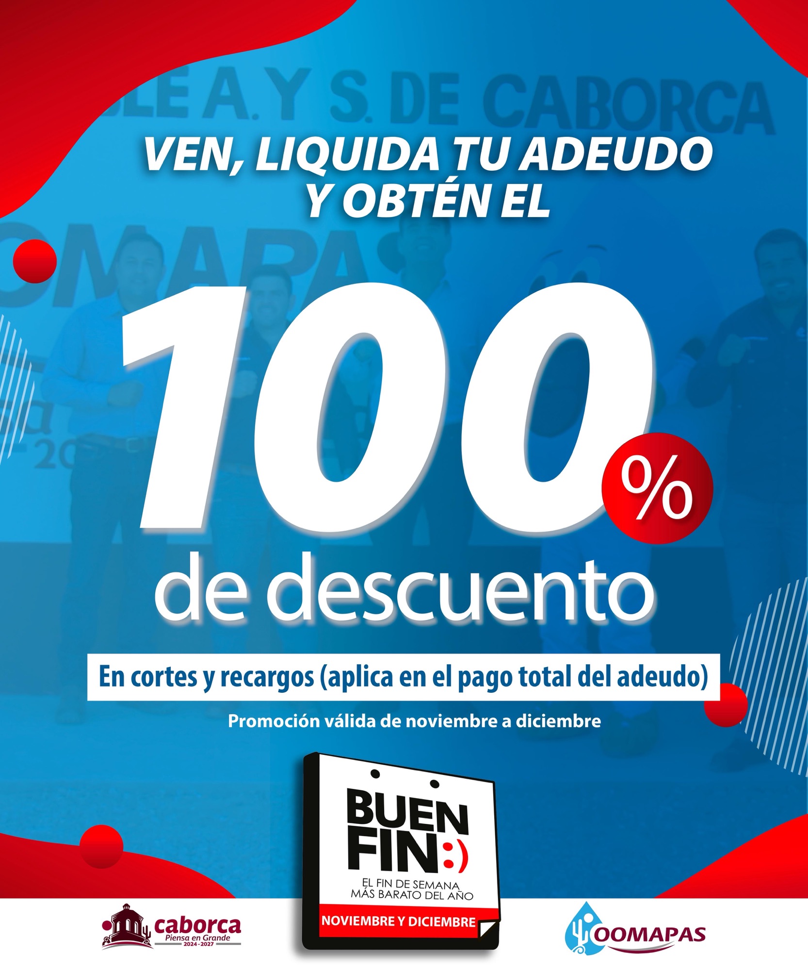 Aprovecha la promoción especial de Oomapas Caborca y liquida tu adeudo con un 100% de descuento en cortes y recargos. Aplica al realizar el pago total de tu adeudo. 📌 Vigencia durante noviembre y diciembre. ¡No dejes pasar esta oportunidad de ponerte al día! CaborcaPiensaenGrande