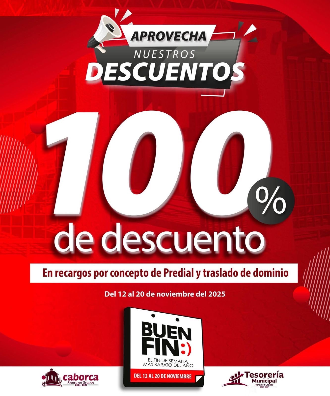 Aprovecha las promociones del fin de semana más barato del año y del 12 al 20 de noviembre, disfruta del: No dejes pasar estos increíbles descuentos que Tesorería Municipal tiene para ti. CaborcaPiensaenGrande
