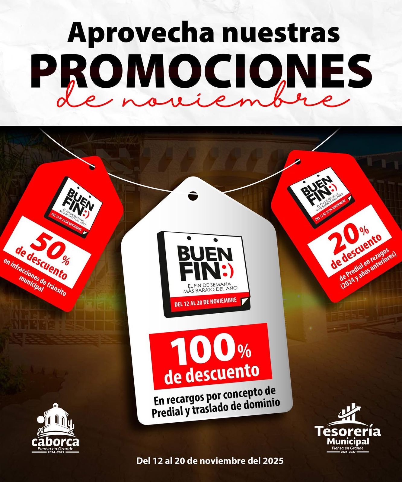 Aprovecha las promociones del fin de semana más barato del año y del 12 al 20 de noviembre, disfruta del: No dejes pasar estos increíbles descuentos que Tesorería Municipal tiene para ti. CaborcaPiensaenGrande