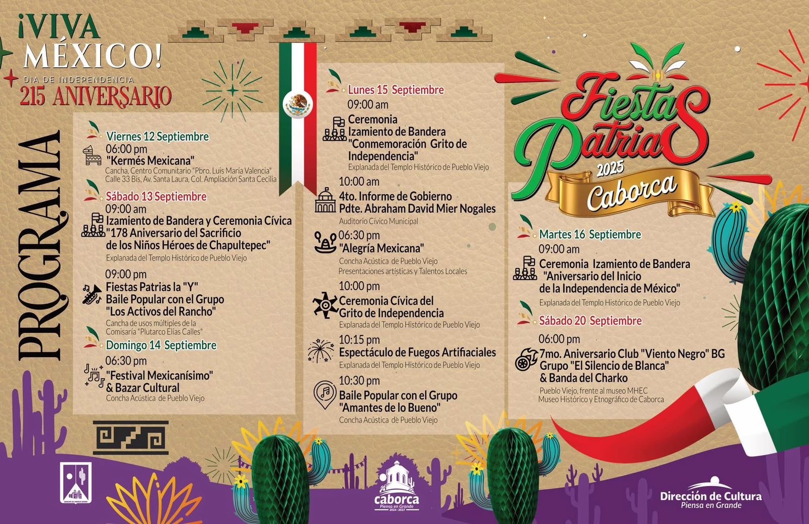 H. Caborca. – El H. Ayuntamiento de Caborca invita a disfrutar de las Fiestas Patrias del 12 al 20 de septiembre con la Kermés Mexicana, el Festival Mexicanísimo, el Bazar Cultural, presentaciones artísticas y mucho más. Este 15 de septiembre a las 10 de la mañana acompaña a nuestro presidente municipal, Abraham “El Cubano” Mier, […]