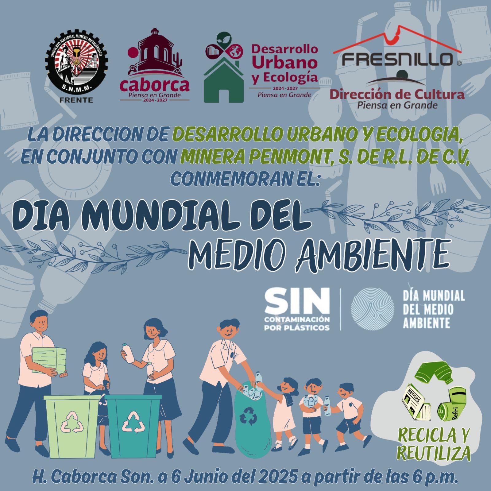 H. Caborca. – En el marco del Día Mundial del Medio Ambiente, el H. Ayuntamiento de Caborca, a través de la Dirección de Desarrollo Urbano y Ecología y la Dirección de Cultura, en coordinación con Minera Penmont y el Sindicato Nacional Minero Metalúrgico FRENTE, invita al evento conmemorativo que se llevará a cabo este viernes 6 de junio a partir de las 6:00 de la tarde en Pueblo Viejo.