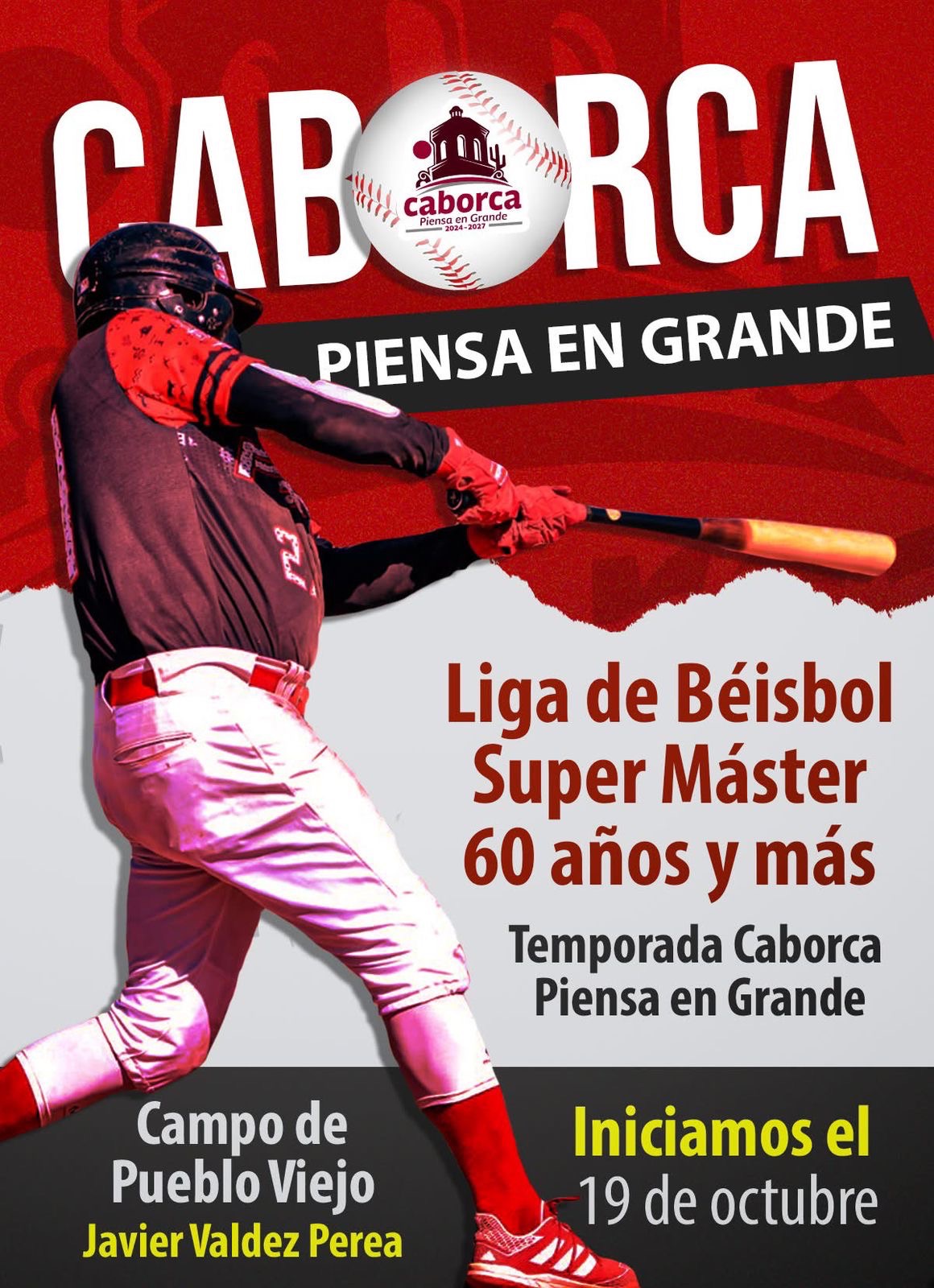 H. Caborca. – Promoviendo el deporte y la activación física, este 19 de octubre no te pierdas la gran inauguración de la “Temporada 2025: Piensa en Grande” de la Liga Municipal de Béisbol Súper Máster 60 y Más.