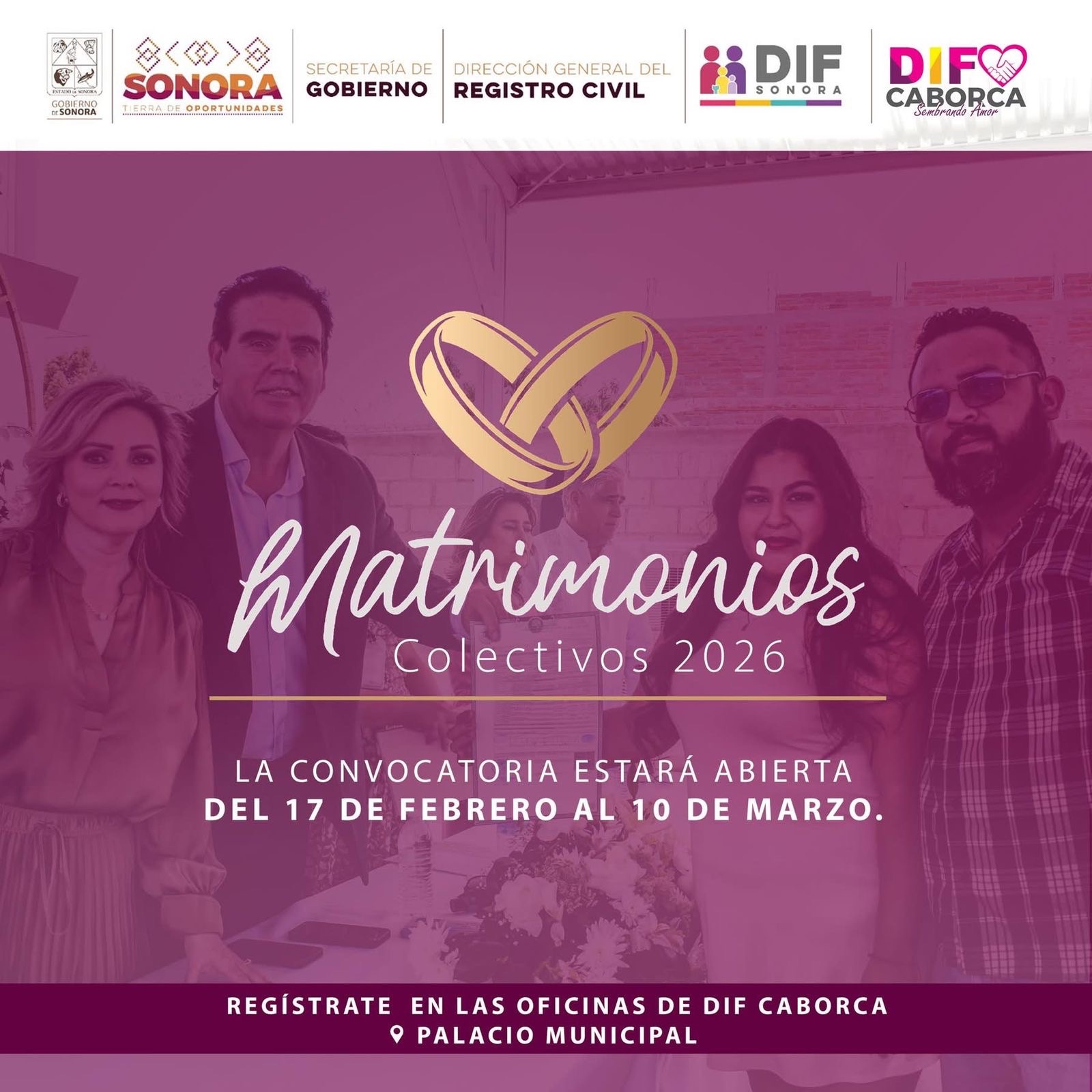 H. Caborca. – El Gobierno del Estado, en coordinación con DIF Sonora, DIF Caborca y la Dirección General del Registro Civil, invita a las parejas del municipio a formar parte de los Matrimonios Colectivos 2026, una iniciativa que promueve la certeza jurídica y el fortalecimiento de las familias.