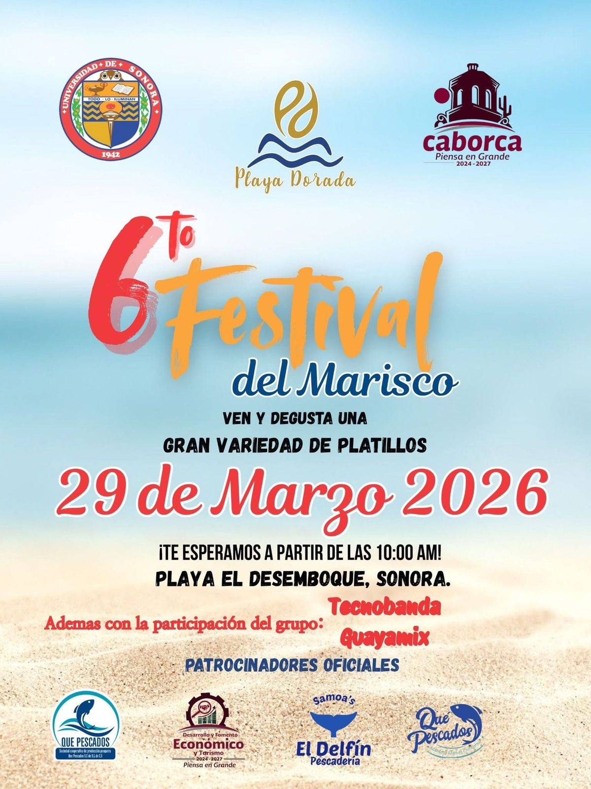 H. Caborca. – Con el objetivo de promover la gastronomía local y el turismo en nuestra región, el H. Ayuntamiento de Caborca, a través de la Dirección de Desarrollo y Fomento Económico, en coordinación con la Universidad de Sonora Campus Caborca y Playa Dorada, te invitan a disfrutar del 6to Festival del Marisco.