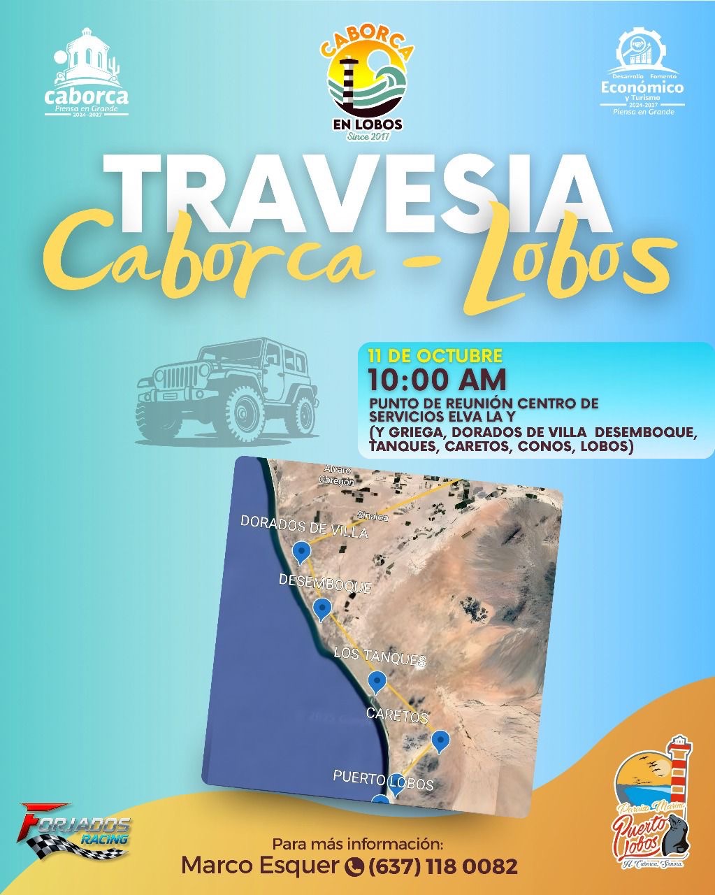 H. Caborca. – Como parte de las actividades de “Caborca en Lobos 2025”, este próximo sábado 11 de octubre se llevará a cabo la Travesía Caborca–Lobos, una ruta todoterreno que promete emoción, paisajes únicos y convivencia entre amantes de la aventura.